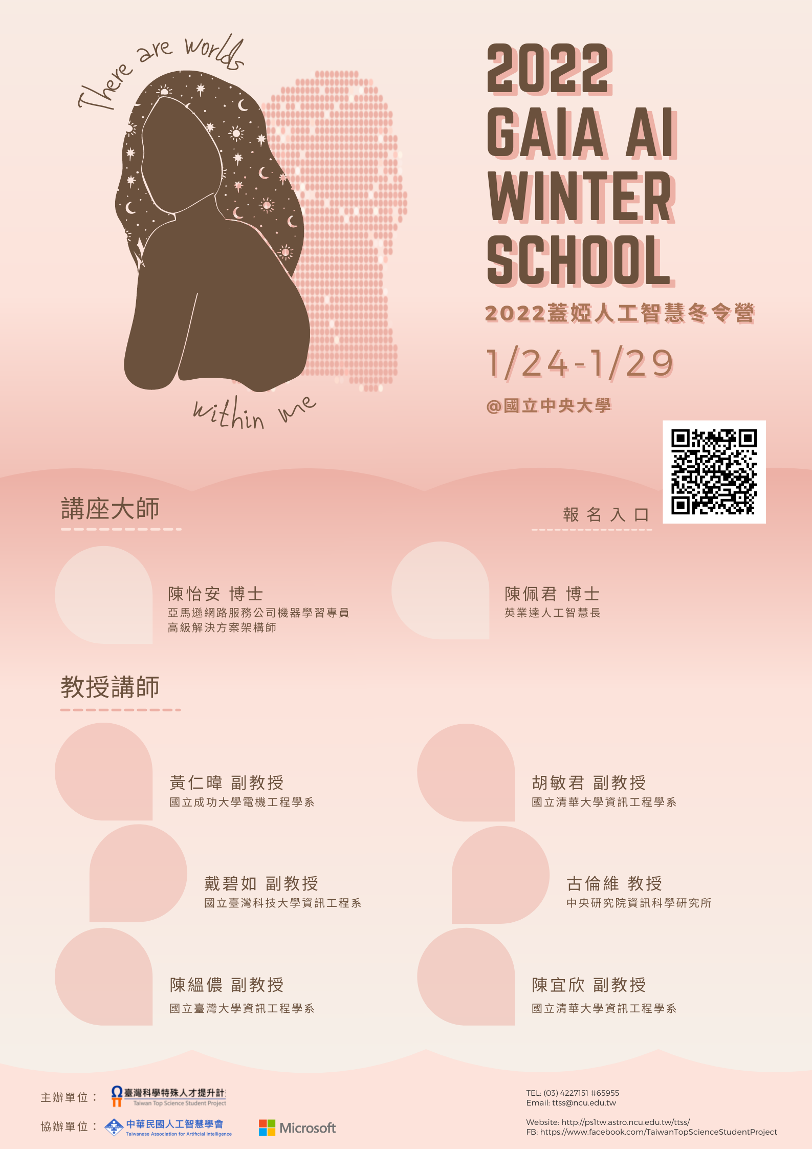 詳細活動資訊請參閱此網址,並以此網站最新公佈為準:http://ps1tw.astro.ncu.edu.tw/ttss/index.php/2022gaiaaiwinterschool/。